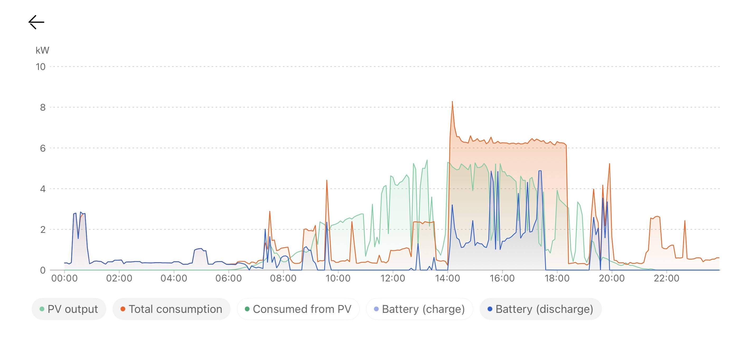 OK, har bara 10 kWh batteri och det räcker liksom inte till, ens ihop med solcellerna. Bilden nedan är exempel på hur laddning kan se ut en sommardag, på vintern laddar jag på natten och då finns ingen energi i batteriet.