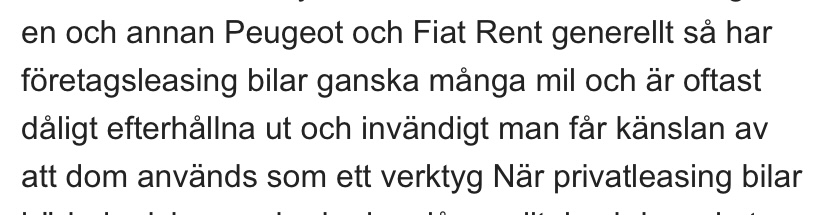 Av just den anledningen köper jag aldrig begagnade tjänstebilar . Säljaren hos Volvo återförsäljaren jag köpte min senaste bil sa detsamma . Privatleasing bilar är oftast i bättre skick än tjänstebilar. Det kom på tal eftersom han undrade varför jag köpte så långt innan jag ska lämna tillbaka min leasingbil . Jag sa då att privatköpta bilar , med en ägare över längre tid av ett märke modell mm som man vill ha , är lite svårt att hitta . Och när det nu var på bekvämt avstånd hemifrån fick man väl slå till då .