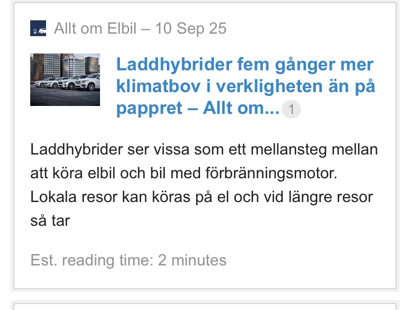 Var ju samma med etanolbilarna, hur miljövänligt var det när man körde på bensin? Sedan var ju motorerna dåligt byggda för etanol så man fick en törstig bil, både för bensin och etanol. Körde själv en etanol-Focus under 4 år, tankade alltid etanol (utom i Danmark där det inte fanns) men hade kollegor som skröt om hur de lurade systemet och fick inköpsrabatt och sedan körde på bensin! Säkert samma sak med hybrider, låga förmånsvärden och så kör man 90% på bensin. Vore kanske bättre med mildhybrider som inte behöver laddas för de som inte orkar bry sig. Sedan vill jag egentligen inte ha laddhybrider vid laddstationerna😁