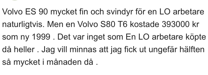 Förr sa man på golvet som Volvo arbetare att en ny Volvo typ DL eller GL kostade en årslön före skatt . Frågade nu idag en Volvoarbetare på plats i Göteborg om hur mycket dom tjänar nu för tiden . Ca 500000 kr blev svaret som jag nog hade gissat på också. Så Svenne banan bilen Tesla model Y istället nu för tiden då , eller VW ID 4 , eller XC 60 om det ska vara Volvo . XC 40 är väl lite trång för barnfamiljen kanske . Bra mycket rymligare och mer utrustade än Volvo 240 -740 - 940 på den tiden . På 240 var det ju inte standard med styrservo och AC , och inga elektriska fönsterhissar eller farthållare heller . Det gick väl inte ändra ratten heller om jag minns rätt ?