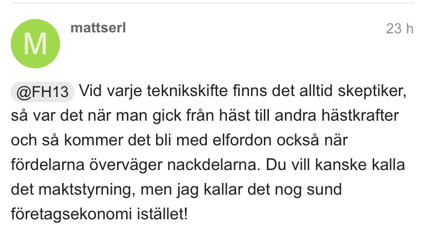 @FH13 Vid varje teknikskifte finns det alltid skeptiker, så var det när man gick från häst till andra hästkrafter och så kommer det bli med elfordon också när fördelarna överväger nackdelarna. Du vill kanske kalla det maktstyrning, men jag kallar det nog sund företagsekonomi istället!
