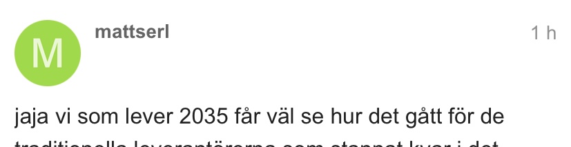 jaja vi som lever 2035 får väl se hur det gått för de traditionella leverantörerna som stannat kvar i det snuttefilt liknande tillståndet för länge och inte satsat fullt ut på elbilar i tid. Än så länge sägs mest OH upp hos leverantörerna, men glöm inte att det kostar betydligt mera i F&U att ta fram och bygga både fossila och elbilar i fabrikerna, även om man bygger dessa på samma plattformar (vilket kanske inte är optimalt för rena elbilar).