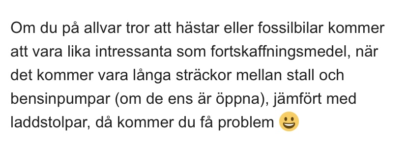 Om du på allvar tror att hästar eller fossilbilar kommer att vara lika intressanta som fortskaffningsmedel, när det kommer vara långa sträckor mellan stall och bensinpumpar (om de ens är öppna), jämfört med laddstolpar, då kommer du få problem ![]()
