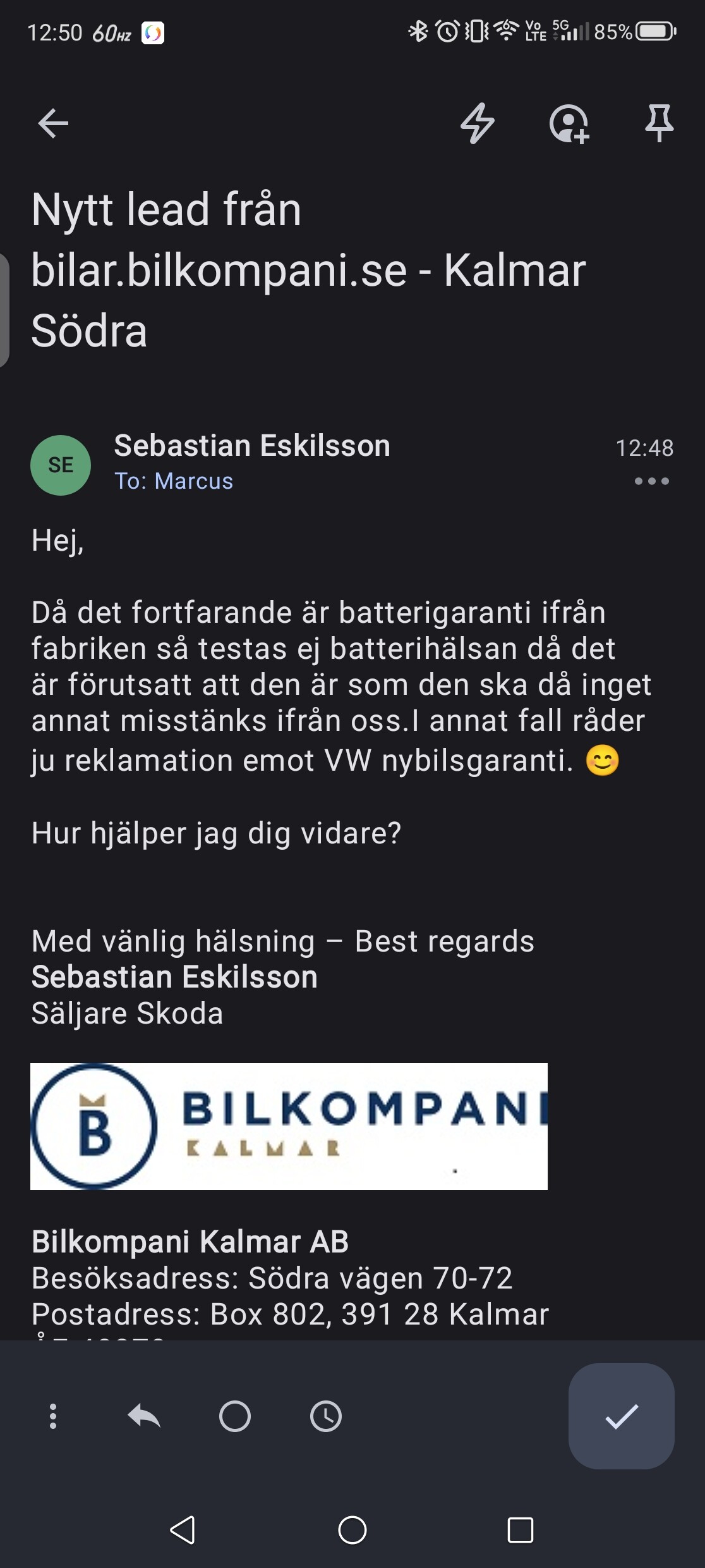Att bilförsäljaren tillhandahåller ett batteri test , borde vara ett grundkrav på en bilhandlare när man säljer en Elbil kan jag tycka . Smidigt på Carla där man kan kolla detta direkt vid första titten på nätet .