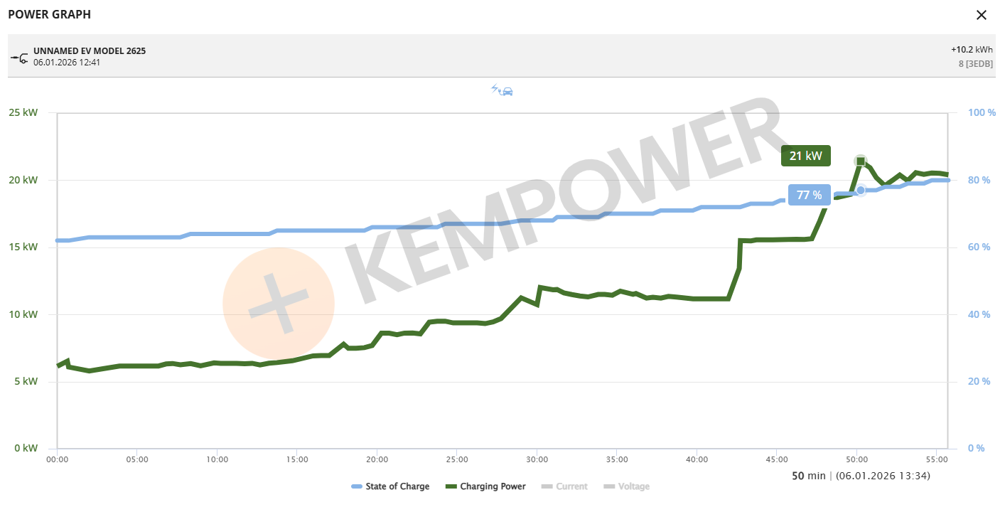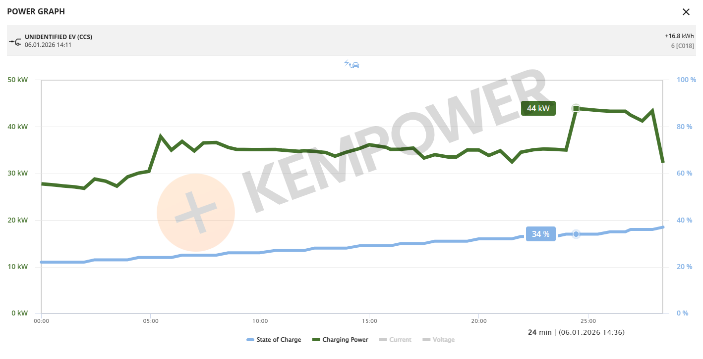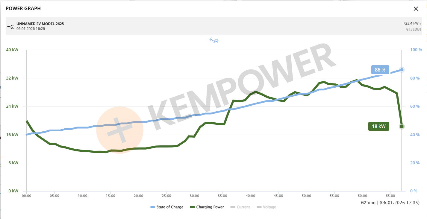 Kommentar: Kunden kommer in iskall och högt dvs sämsta möjliga kombination, BMS gör allt den kan för att skydda celler, stryper ner effekten till 6kW. Efter 30min når vi 11kW vid 67%. Det som är positivt här är att verkar finnas en funktion i bilen som tillsätter värme under DC-laddning även om det verkar vara väldigt låg effekt. Kunden får 10kWh på cirka 60min vilket innebär att jag vill avråda samtliga att köpa en Renault 5 om man tänker snabbladda vintertid överhuvudtaget, underbar liten bil men absolut krav med egen AC-laddare hemma. Värt att nämna är att även AC-laddningen begränsas av BMS vid ett sådan scenario.
