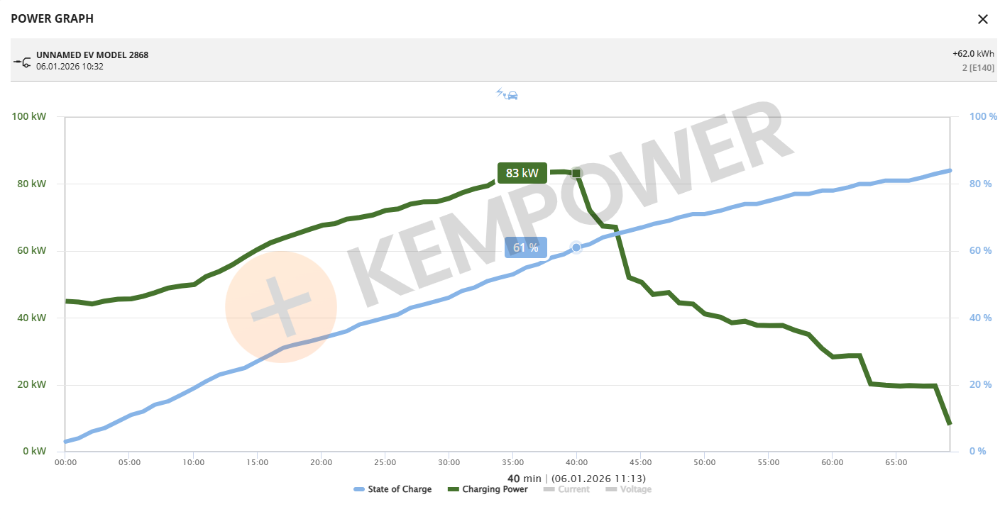 Kommentar: Volvo EX40 gör det bra, BMS släpper dynamiskt på mer och efter 40min vid 61% når vi peak på 83kW, därefter brant kurva ner, anledning till det är att BMS därefter bedömer att man behöver bromsa kraftigt då man inte fått med sig tillräckligt med värme som krävs högre upp i SoC. Här blir det också tydligt att Volvo har klenare hårdvara för att generera värme jämfört med BMW som är benchmark tillsammans med Porsche. Volvo C40 och Polestar 2 har exakt samma beteende.