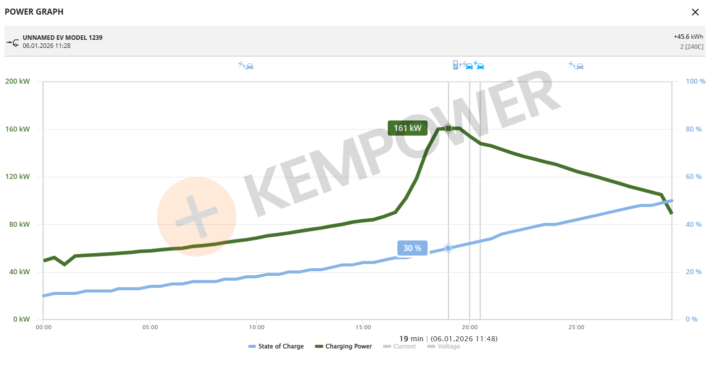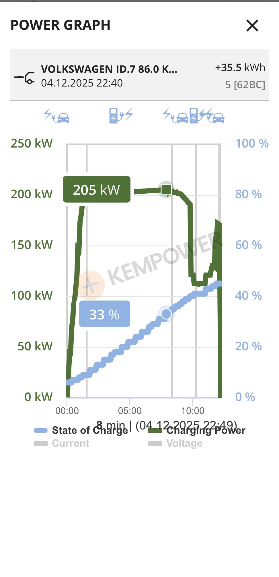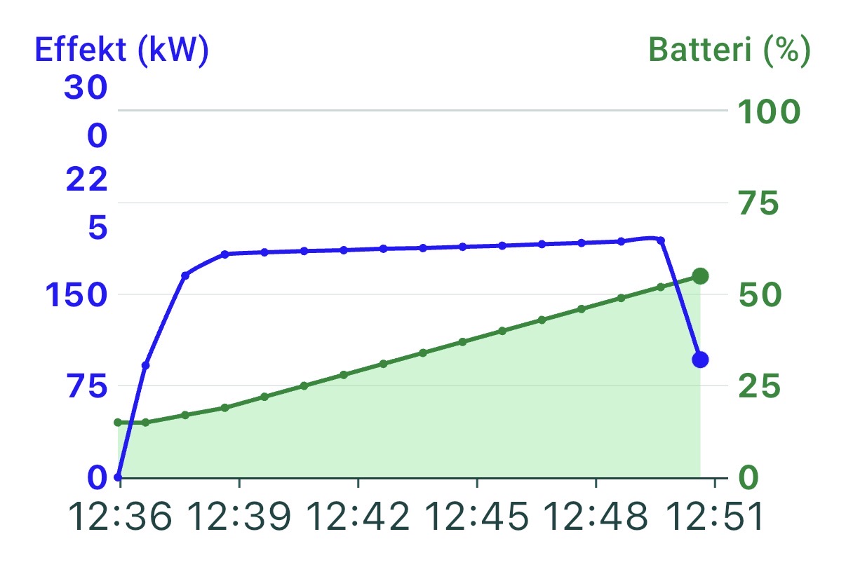 Kommentar: Här har BMW gjort hemläxan, kraftfull värme skjuts till batteriet där BMS dynamiskt släpper på mer, efter 19min in bedömer batteriets BMS att det är säkert att släppa på fullt, därefter följs den optimala kurvan. Detta är på min “150kW" laddare, för ett ögonblick begär faktiskt bilen mer än vi kan erbjuda eftersom jag har en hård limit på 400A på 150kW-laddaren. Alla BMW elbilar från modern tid beter sig så här.
