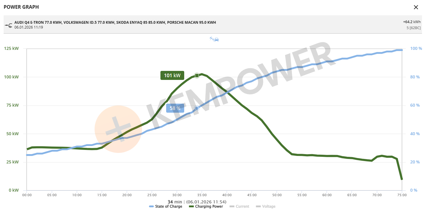 Kommentar: Ganska likt hur Volvo EX40 hanterar det, når 101kW efter 34min, första 15min är effekten svagt sjunkande innan värmen har genererats, allt för att skydda celler eftersom vi går upp i SoC men vi har inte värmen som krävs, när vi har passerat en tröskel skjuter effekten upp dynamiskt.