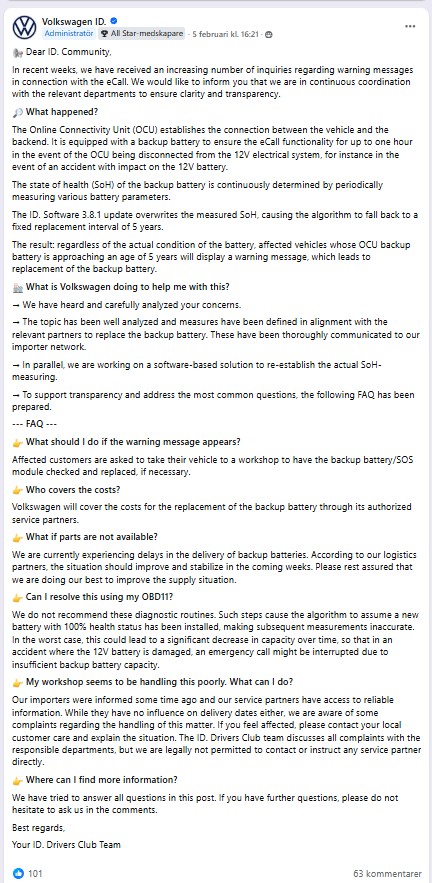 VW gör själva ett inlägg FB-gruppen ID. Drivers Club (bifogar bild) att en mjukvaruuppdatering gör så att alla bilar som närmar sig 5 år får den gula varningslampan för att SOS emergency call inte fungerar tänd. Den säger då att back-up batteriet måste bytes oavsett om så är fallet eller inte. I inlägget säger VW att VW står för kostnaden för batteribytet och att man jobbar på en lösning för mjukvarufelet. Vid kontakt med servicepartners i Stockholmsområdet känner ingen till något om detta och man vill först ha 1950 kr för felsökning och sedan betalt för åtgärd vilket handlar om många tusen till så vitt jag förstår. Av kommentarerna till FB-inlägget att döma är det samma situation i typ alla länder och kunderna får betala för VWs mjukvaruinkompetens och oförmåga att kommunicera till sina partners. Bör man ta detta till ARN? Svårt att bevisa vad det är för fel själv dock.