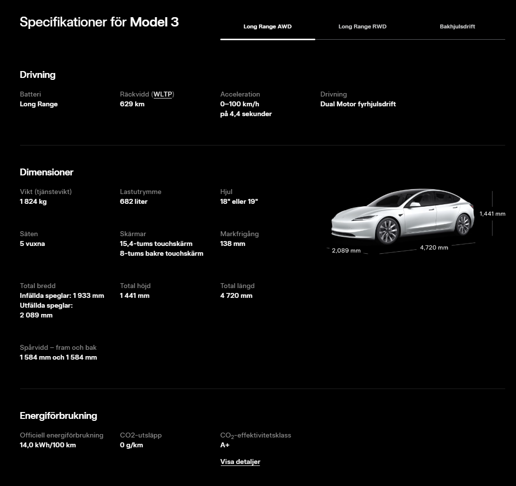 Tesla har tagit bort “Energiförbrukning” för LR RWD sedan jag skrev igår, där det stod 13,6kwh/100km. Här är hur det ser ut på LR AWD, :