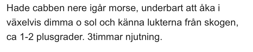 Hade cabben nere igår morse, underbart att åka i växelvis dimma o sol och känna lukterna från skogen, ca 1-2 plusgrader. 3timmar njutning.