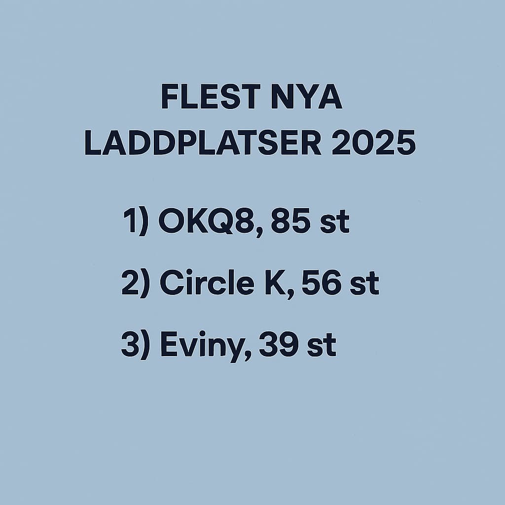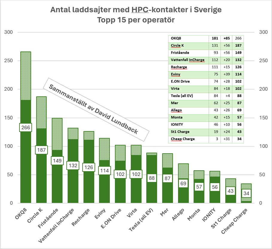 Sveriges ‘största’ laddoperatör OKQ8/Skellefteå Kraft, med 266 laddsajter, har fortsatt sin expansion under 2025 och utökar gapet i antal sajter med snabbladdning. Det ska tilläggas att man generellt bygger fler men mindre laddsajter är övriga laddoperatörer.