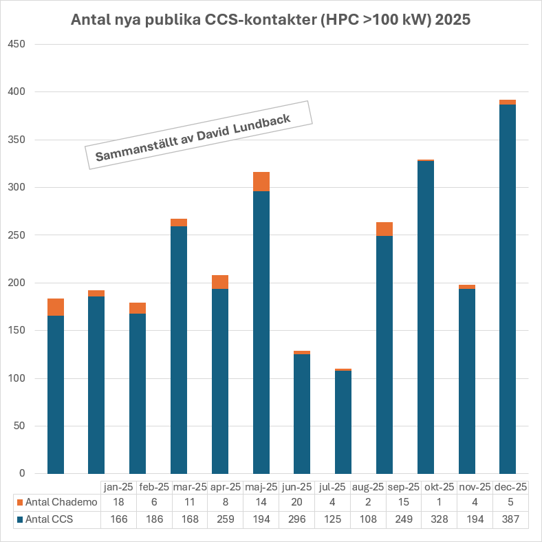 December blev årets starkaste månad för 2025 med 86 nya laddsajter och 387 nya CCS-kontakter.