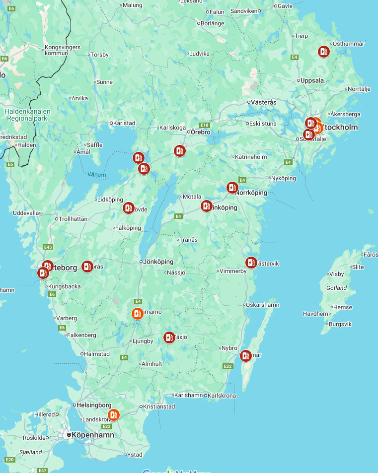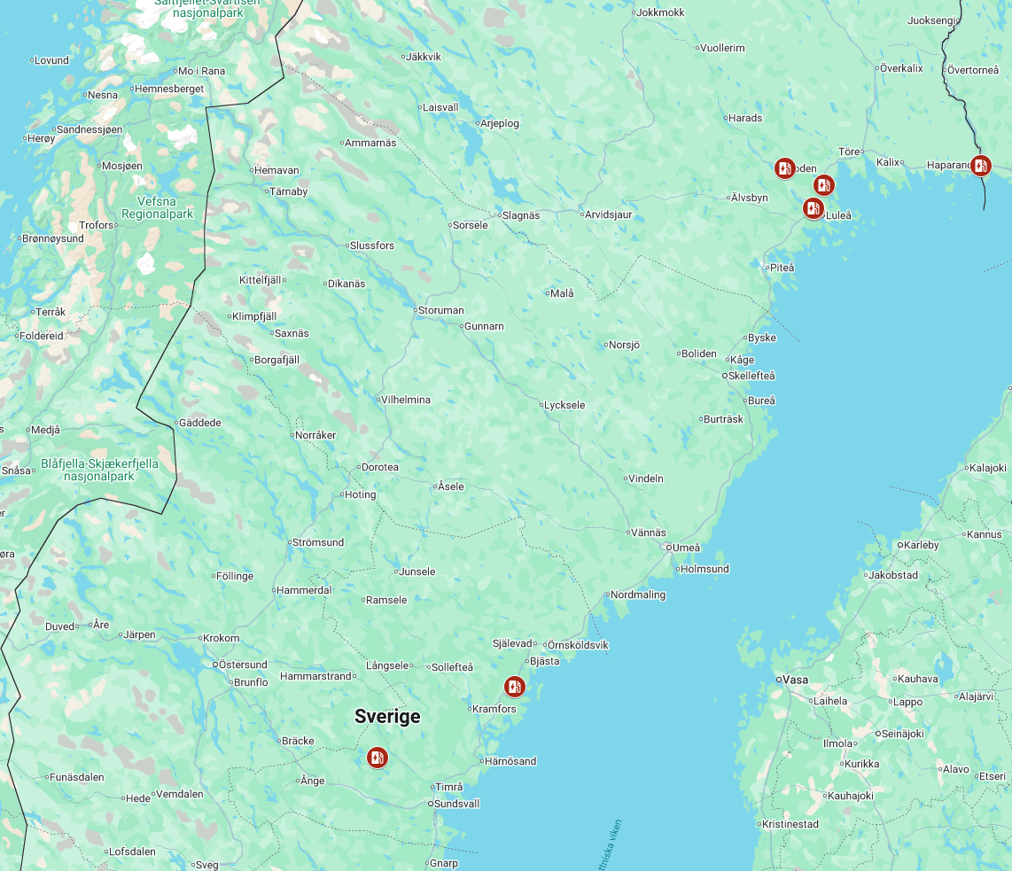 Plustecknet i listan nedan anger en uppgraderad befintlig laddplats.