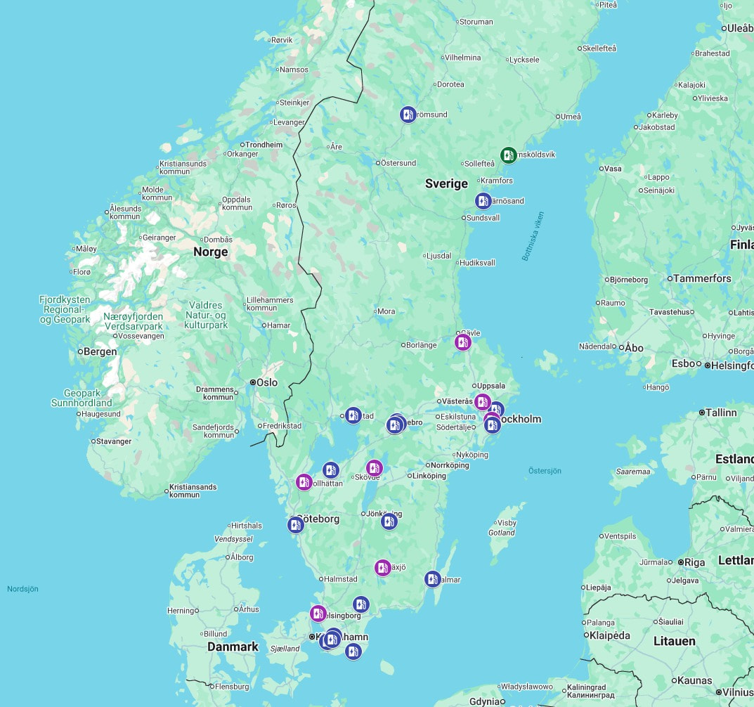 Plustecknet i listan nedan anger en uppgraderad befintlig laddplats.