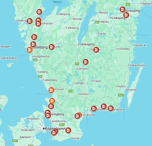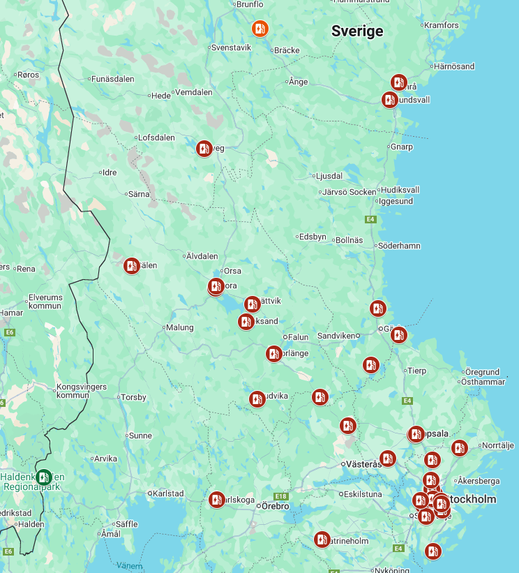Plustecknet i listan nedan anger en uppgraderad befintlig laddplats.