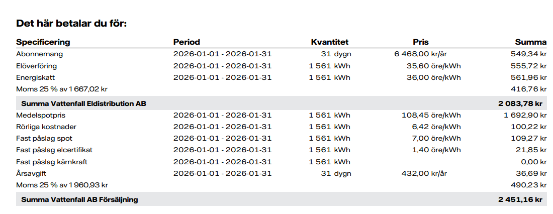 Förvånansvärt liten besparing, 1041:- för januari, varav 430:- är effektavgiften. Så cirka 600:- i besparing om större delen av elförbrukningen köps in på natten.
