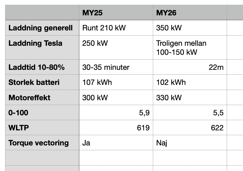 Tack men jag frågade om skillnaden på 2025 (MY25 i ditt vokabulär) och 2026 årsmodell (MY26) Jag vet att 800 volt är vid snabbladdning men det har inte en lantbrukare som helst kör på diesel en aning om men ser när ett erbjudande är så bra att man egentligen inte kan tacka nej